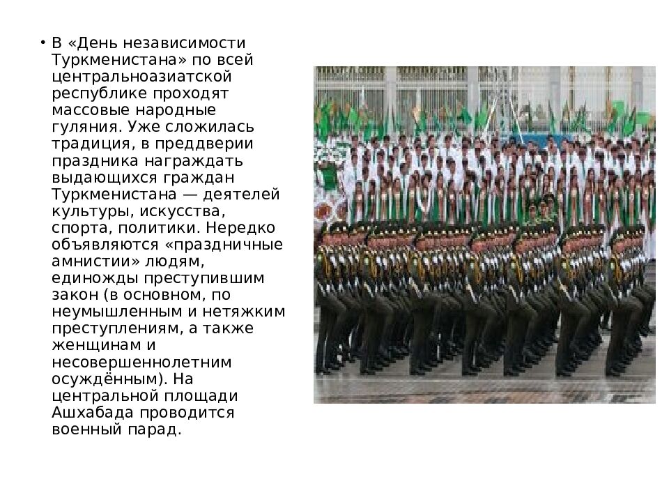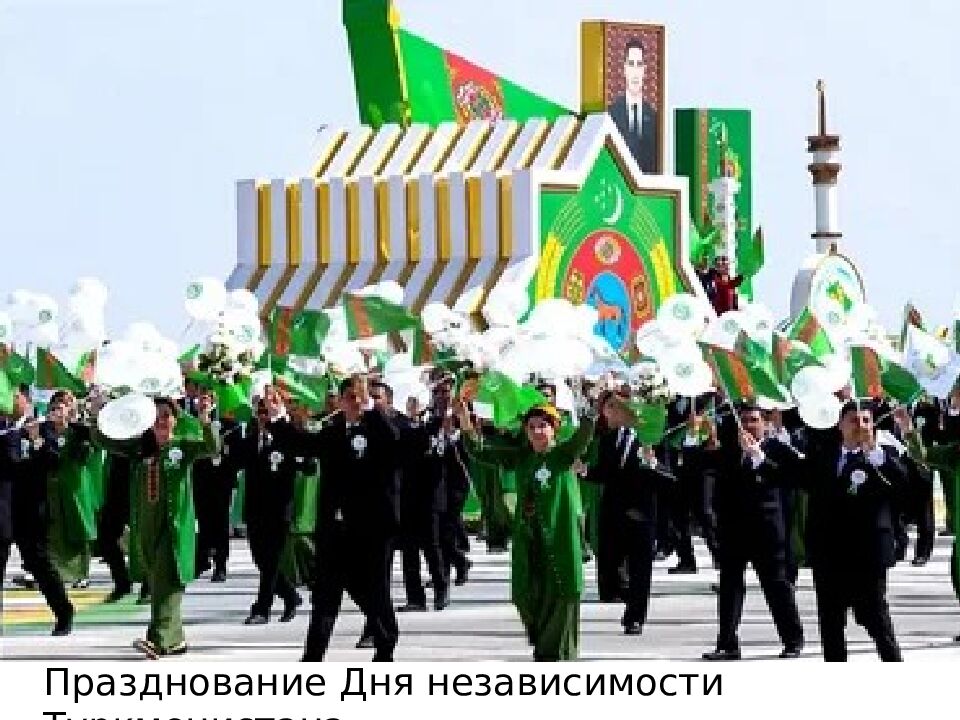 В «День независимости Туркменистана» по всей центральноазиатской республике проходят массовые народные гуляния. Уже сложилась традиция, в преддверии праздника награждать выдающихся граждан Туркменистана — деятелей культуры, искусства, спорта, политики. Нередко объявляются «праздничные амнистии» людям, единожды преступившим закон (в основном, по неумышленным и нетяжким преступлениям, а также женщинам и несовершеннолетним осуждённым). На центральной площади Ашхабада проводится военный парад.