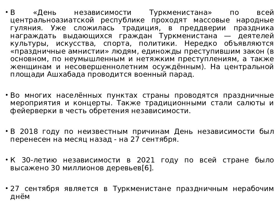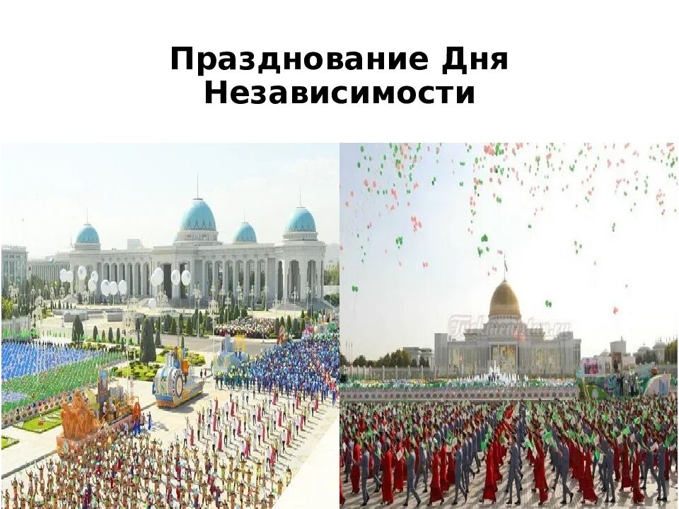 В «День независимости Туркменистана» по всей центральноазиатской республике проходят массовые народные гуляния. Уже сложилась традиция, в преддверии праздника награждать выдающихся граждан Туркменистана — деятелей культуры, искусства, спорта, политики. Нередко объявляются «праздничные амнистии» людям, единожды преступившим закон (в основном, по неумышленным и нетяжким преступлениям, а также женщинам и несовершеннолетним осуждённым). На центральной площади Ашхабада проводится военный парад. Во многих населённых пунктах страны проводятся праздничные мероприятия и концерты. Также традиционными стали салюты и фейерверки в честь обретения независимости. В 2018 году по неизвестным причинам День независимости был перенесен на месяц назад - на 27 сентября. К 30-летию независимости в 2021 году по всей стране было высажено 30 миллионов деревьев[6]. 27 сентября является в Туркменистане праздничным нерабочим днём