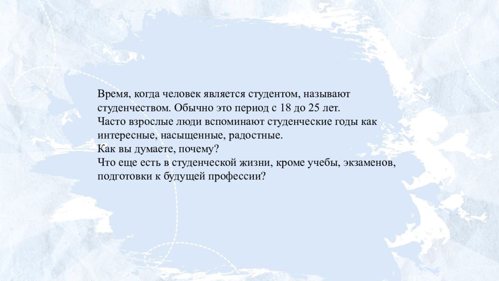 Время, когда человек является студентом, называют студенчеством. Обычно это период с 18 до 25 лет. Часто взрослые люди вспоминают студенческие годы как интересные, насыщенные, радостные. Как вы думаете, почему? Что еще есть в студенческой жизни, кроме учебы, экзаменов, подготовки к будущей профессии?