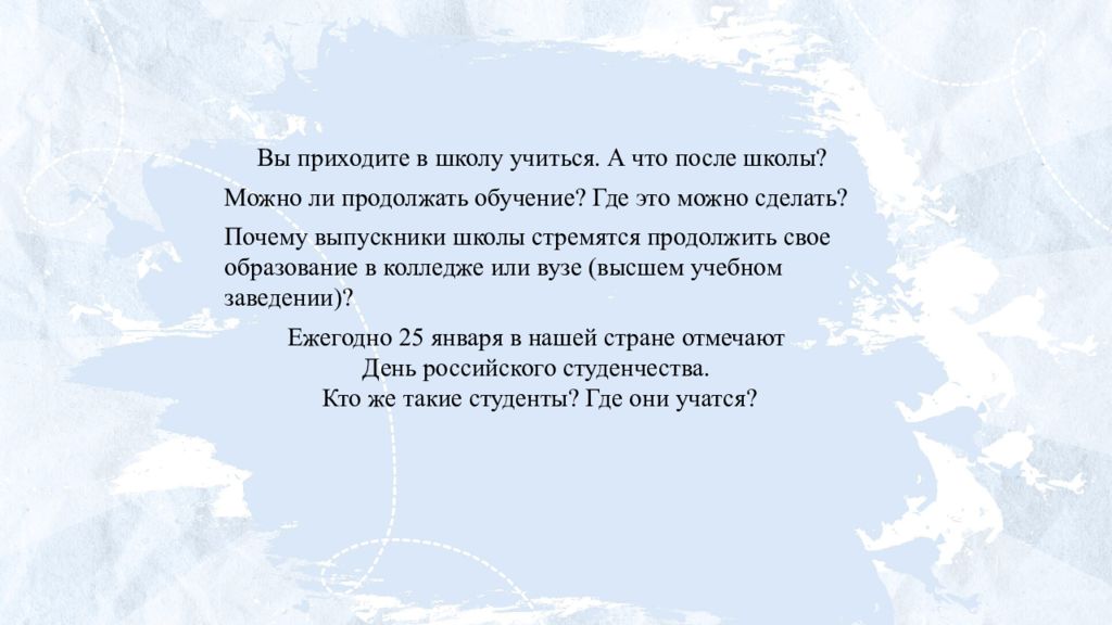 Вы приходите в школу учиться. А что после школы? Можно ли продолжать обучение? Где это можно сделать? Почему выпускники школы стремятся продолжить свое образование в колледже или вузе (высшем учебном заведении)? Ежегодно 25 января в нашей стране отмечают День российского студенчества. Кто же такие студенты? Где они учатся?