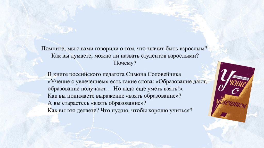 Помните, мы с вами говорили о том, что значит быть взрослым? Как вы думаете, можно ли назвать студентов взрослыми? Почему? В книге российского педагога Симона Соловейчика «Учение с увлечением» есть такие слова: «Образование дают, образование получают… Но надо еще уметь взять!». Как вы понимаете выражение «взять образование»? А вы стараетесь «взять образование»? Как вы это делаете? Что нужно, чтобы хорошо учиться?
