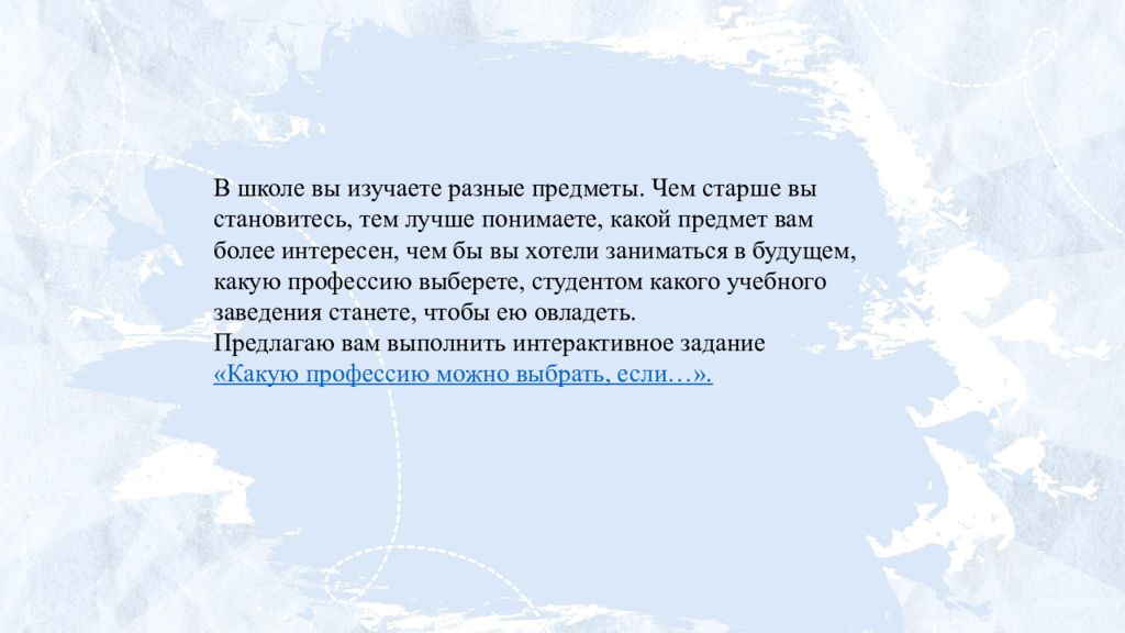 В школе вы изучаете разные предметы. Чем старше вы становитесь, тем лучше понимаете, какой предмет вам более интересен, чем бы вы хотели заниматься в будущем, какую профессию выберете, студентом какого учебного заведения станете, чтобы ею овладеть. Предлагаю вам выполнить интерактивное задание «Какую профессию можно выбрать, если…».
