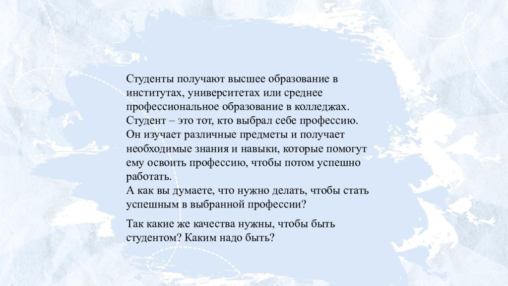 Студенты получают высшее образование в институтах, университетах или среднее профессиональное образование в колледжах. Студент – это тот, кто выбрал себе профессию. Он изучает различные предметы и получает необходимые знания и навыки, которые помогут ему освоить профессию, чтобы потом успешно работать. А как вы думаете, что нужно делать, чтобы стать успешным в выбранной профессии? Так какие же качества нужны, чтобы быть студентом? Каким надо быть?