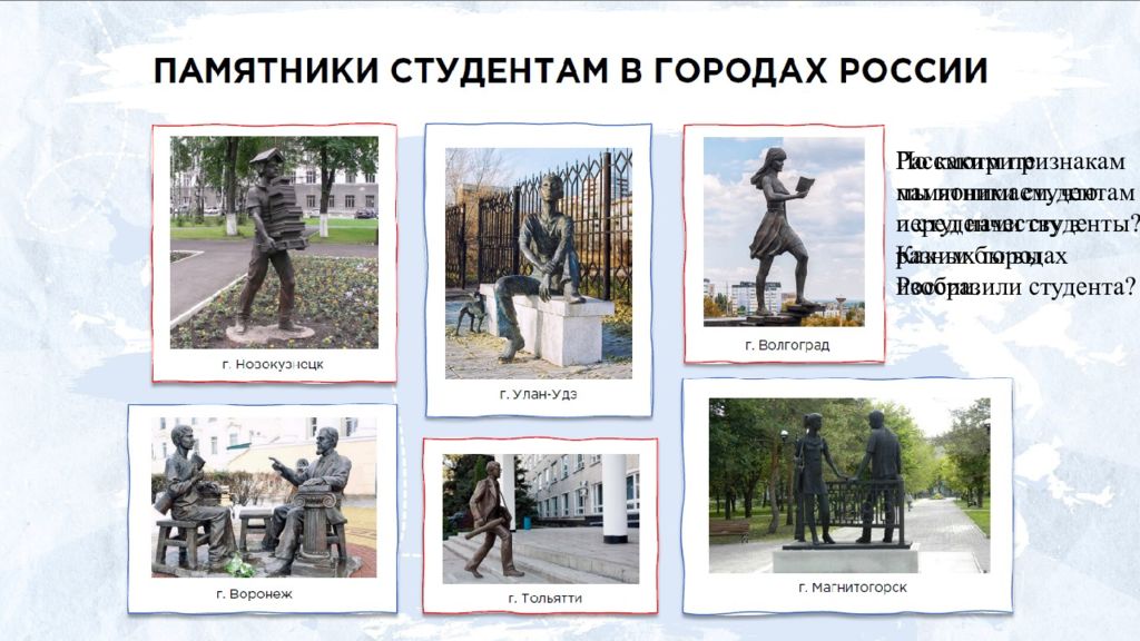 Рассмотрите памятники студентам и студенчеству в разных городах России. По каким признакам мы понимаем, что перед нами студенты? Каким бы вы изобразили студента?