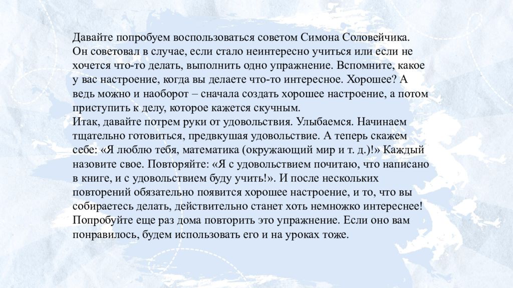 Давайте попробуем воспользоваться советом Симона Соловейчика. Он советовал в случае, если стало неинтересно учиться или если не хочется что-то делать, выполнить одно упражнение. Вспомните, какое у вас настроение, когда вы делаете что-то интересное. Хорошее? А ведь можно и наоборот – сначала создать хорошее настроение, а потом приступить к делу, которое кажется скучным. Итак, давайте потрем руки от удовольствия. Улыбаемся. Начинаем тщательно готовиться, предвкушая удовольствие. А теперь скажем себе: «Я люблю тебя, математика (окружающий мир и т. д.)!» Каждый назовите свое. Повторяйте: «Я с удовольствием почитаю, что написано в книге, и с удовольствием буду учить!». И после нескольких повторений обязательно появится хорошее настроение, и то, что вы собираетесь делать, действительно станет хоть немножко интереснее! Попробуйте еще раз дома повторить это упражнение. Если оно вам понравилось, будем использовать его и на уроках тоже.