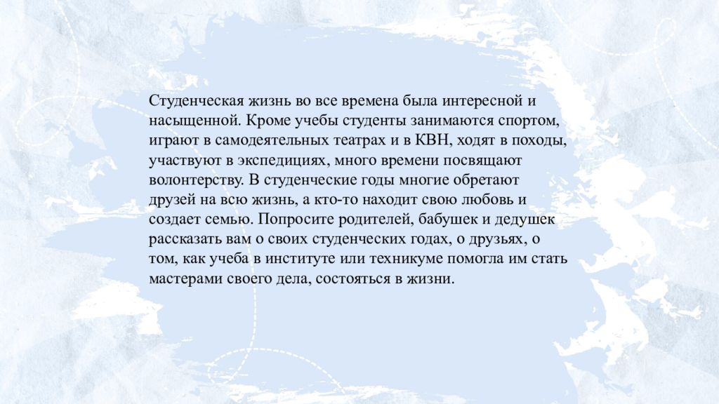 Студенческая жизнь во все времена была интересной и насыщенной. Кроме учебы студенты занимаются спортом, играют в самодеятельных театрах и в КВН, ходят в походы, участвуют в экспедициях, много времени посвящают волонтерству. В студенческие годы многие обретают друзей на всю жизнь, а кто-то находит свою любовь и создает семью. Попросите родителей, бабушек и дедушек рассказать вам о своих студенческих годах, о друзьях, о том, как учеба в институте или техникуме помогла им стать мастерами своего дела, состояться в жизни.