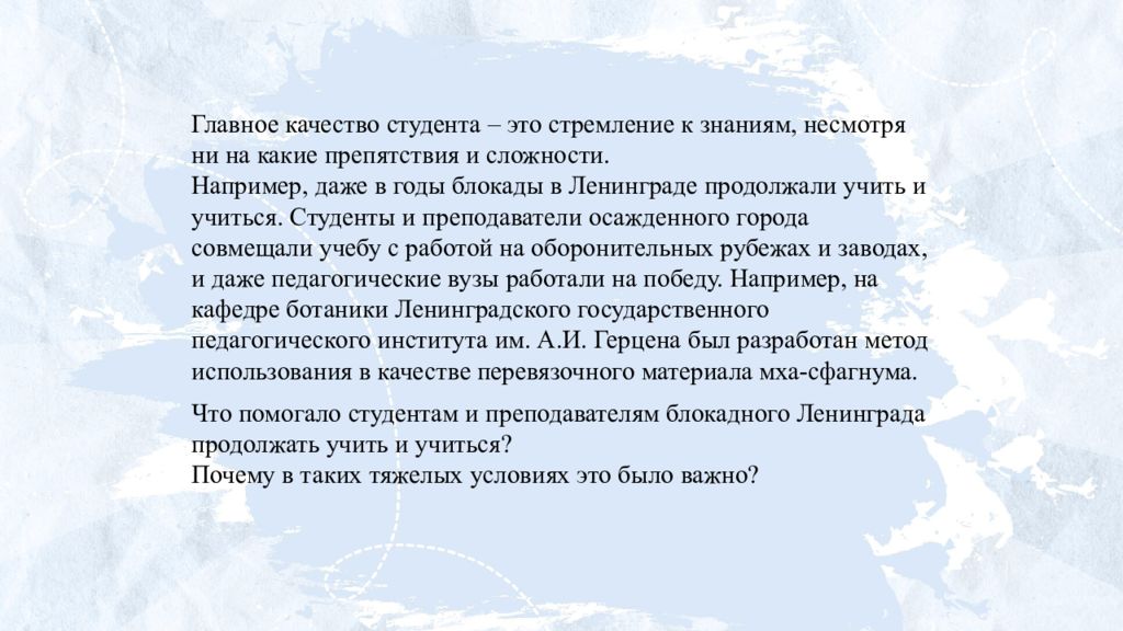 Главное качество студента – это стремление к знаниям, несмотря ни на какие препятствия и сложности. Например, даже в годы блокады в Ленинграде продолжали учить и учиться. Студенты и преподаватели осажденного города совмещали учебу с работой на оборонительных рубежах и заводах, и даже педагогические вузы работали на победу. Например, на кафедре ботаники Ленинградского государственного педагогического института им. А.И. Герцена был разработан метод использования в качестве перевязочного материала мха-сфагнума. Что помогало студентам и преподавателям блокадного Ленинграда продолжать учить и учиться? Почему в таких тяжелых условиях это было важно?