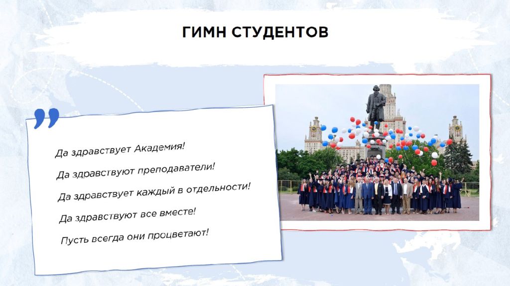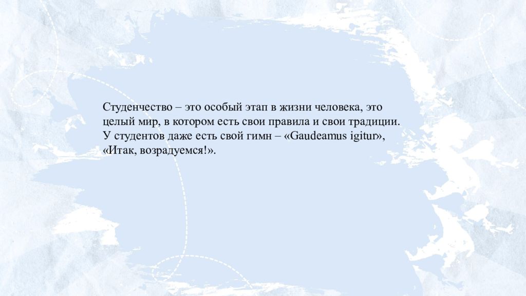 Студенчество – это особый этап в жизни человека, это целый мир, в котором есть свои правила и свои традиции. У студентов даже есть свой гимн – « Gaudeamus igitur », «Итак, возрадуемся!».