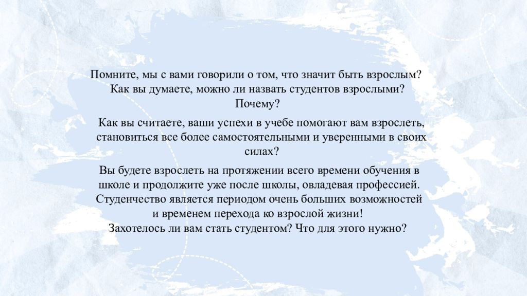 Помните, мы с вами говорили о том, что значит быть взрослым? Как вы думаете, можно ли назвать студентов взрослыми? Почему? Как вы считаете, ваши успехи в учебе помогают вам взрослеть, становиться все более самостоятельными и уверенными в своих силах? Вы будете взрослеть на протяжении всего времени обучения в школе и продолжите уже после школы, овладевая профессией. Студенчество является периодом очень больших возможностей и временем перехода ко взрослой жизни! Захотелось ли вам стать студентом? Что для этого нужно?