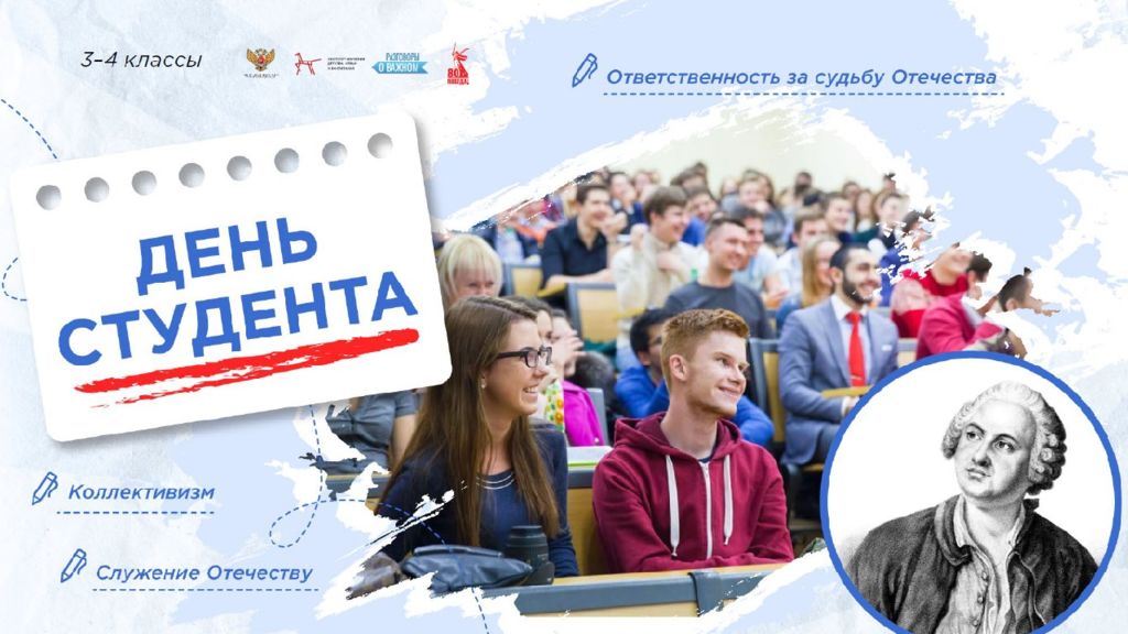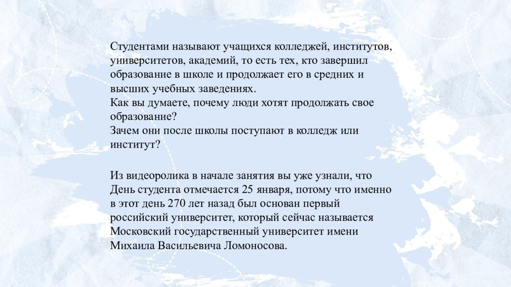 Студентами называют учащихся колледжей, институтов, университетов, академий, то есть тех, кто завершил образование в школе и продолжает его в средних и высших учебных заведениях. Как вы думаете, почему люди хотят продолжать свое образование? Зачем они после школы поступают в колледж или институт? Из видеоролика в начале занятия вы уже узнали, что День студента отмечается 25 января, потому что именно в этот день 270 лет назад был основан первый российский университет, который сейчас называется Московский государственный университет имени Михаила Васильевича Ломоносова.