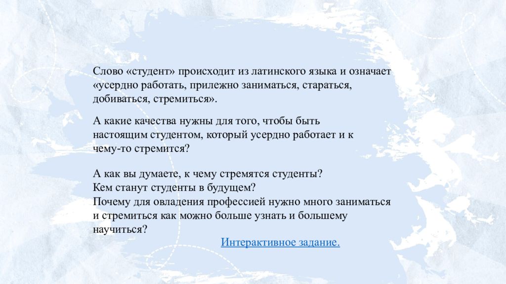 Слово «студент» происходит из латинского языка и означает «усердно работать, прилежно заниматься, стараться, добиваться, стремиться». А какие качества нужны для того, чтобы быть настоящим студентом, который усердно работает и к чему-то стремится? А как вы думаете, к чему стремятся студенты? Кем станут студенты в будущем? Почему для овладения профессией нужно много заниматься и стремиться как можно больше узнать и большему научиться? Интерактивное задание.