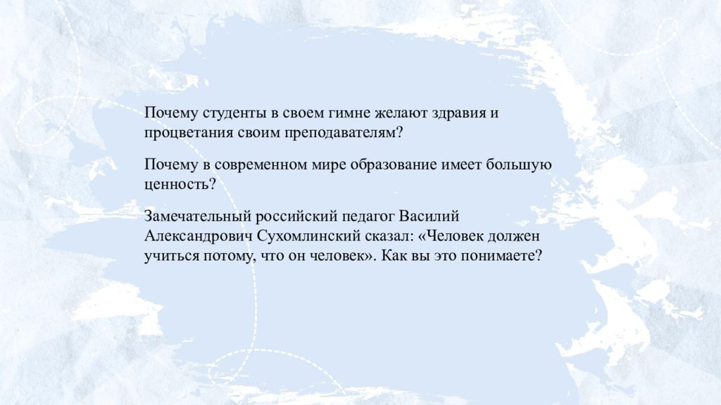 Почему студенты в своем гимне желают здравия и процветания своим преподавателям? Почему в современном мире образование имеет большую ценность? Замечательный российский педагог Василий Александрович Сухомлинский сказал: «Человек должен учиться потому, что он человек». Как вы это понимаете?