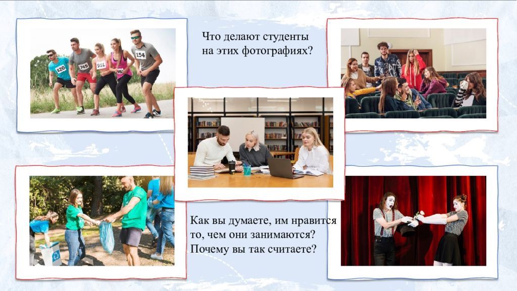 Что делают студенты на этих фотографиях? Как вы думаете, им нравится то, чем они занимаются? Почему вы так считаете?