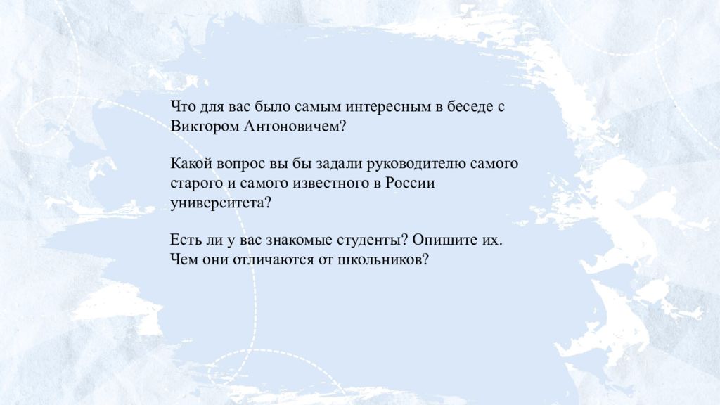 Что для вас было самым интересным в беседе с Виктором Антоновичем? Какой вопрос вы бы задали руководителю самого старого и самого известного в России университета? Есть ли у вас знакомые студенты? Опишите их. Чем они отличаются от школьников?