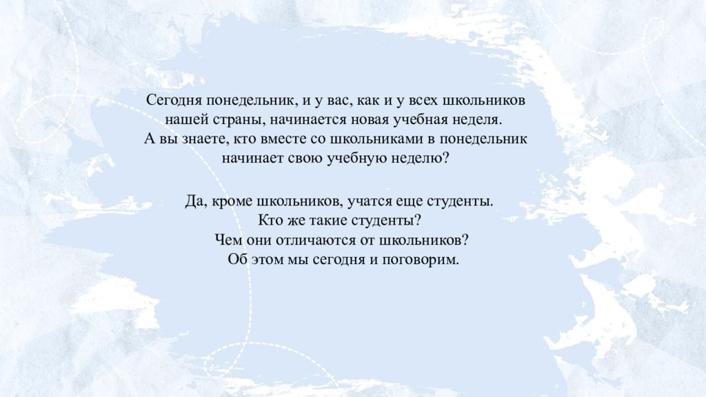 Сегодня понедельник, и у вас, как и у всех школьников нашей страны, начинается новая учебная неделя. А вы знаете, кто вместе со школьниками в понедельник начинает свою учебную неделю? Да, кроме школьников, учатся еще студенты. Кто же такие студенты? Чем они отличаются от школьников? Об этом мы сегодня и поговорим.