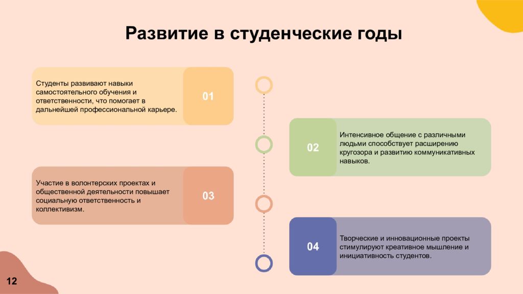 Развитие в студенческие годы Студенты развивают навыки самостоятельного обучения и ответственности, что помогает в дальнейшей профессиональной карьере. Участие в волонтерских проектах и общественной деятельности повышает социальную ответственность и коллективизм. Интенсивное общение с различными людьми способствует расширению кругозора и развитию коммуникативных навыков. Творческие и инновационные проекты стимулируют креативное мышление и инициативность студентов. 12