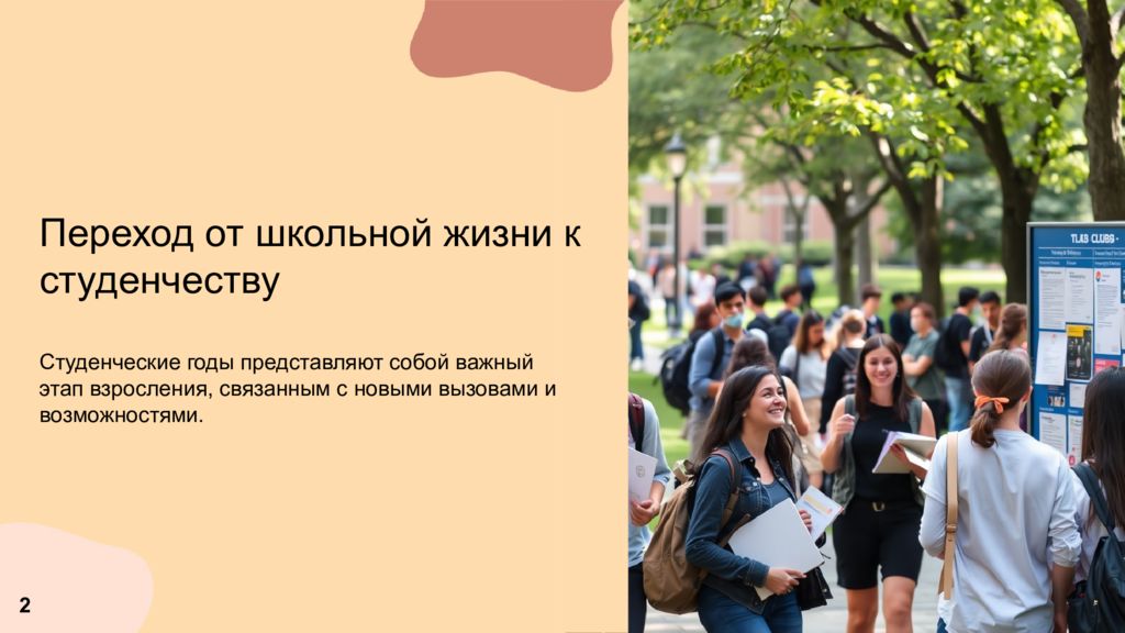 Переход от школьной жизни к студенчеству Студенческие годы представляют собой важный этап взросления, связанным с новыми вызовами и возможностями. 2