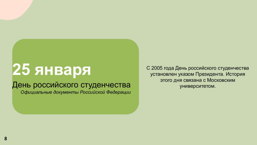 25 января День российского студенчества Официальные документы Российской Федерации С 2005 года День российского студенчества установлен указом Президента. История этого дня связана с Московским университетом. 8