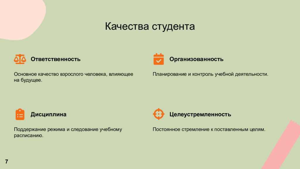 Качества студента Ответственность Основное качество взрослого человека, влияющее на будущее. Организованность Планирование и контроль учебной деятельности. Дисциплина Поддержание режима и следование учебному расписанию. Целеустремленность Постоянное стремление к поставленным целям. 7