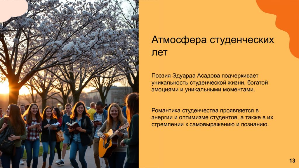 Атмосфера студенческих лет Поэзия Эдуарда Асадова подчеркивает уникальность студенческой жизни, богатой эмоциями и уникальными моментами. Романтика студенчества проявляется в энергии и оптимизме студентов, а также в их стремлении к самовыражению и познанию. 13