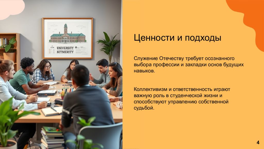 Ценности и подходы Служение Отечеству требует осознанного выбора профессии и закладки основ будущих навыков. Коллективизм и ответственность играют важную роль в студенческой жизни и способствуют управлению собственной судьбой. 4