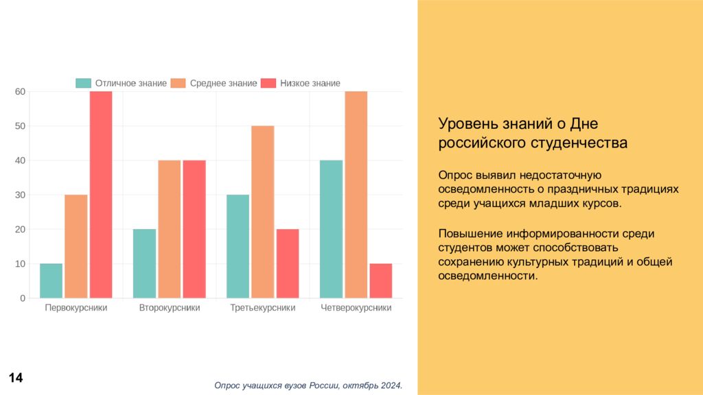 Уровень знаний о Дне российского студенчества Опрос выявил недостаточную осведомленность о праздничных традициях среди учащихся младших курсов. Повышение информированности среди студентов может способствовать сохранению культурных традиций и общей осведомленности. Опрос учащихся вузов России, октябрь 202 4. 14