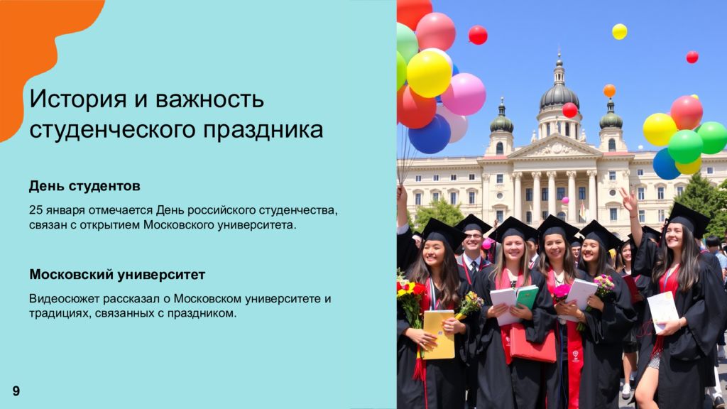 История и важность студенческого праздника День студентов 25 января отмечается День российского студенчества, связан с открытием Московского университета. Московский университет Видеосюжет рассказал о Московском университете и традициях, связанных с праздником. 9