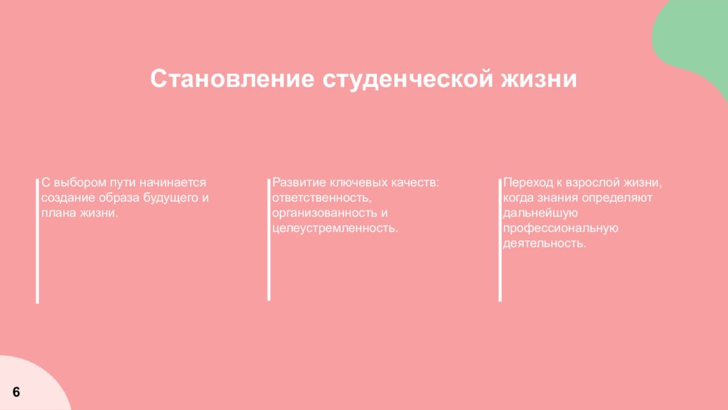 Становление студенческой жизни С выбором пути начинается создание образа будущего и плана жизни. Переход к взрослой жизни, когда знания определяют дальнейшую профессиональную деятельность. Развитие ключевых качеств: ответственность, организованность и целеустремленность. 6