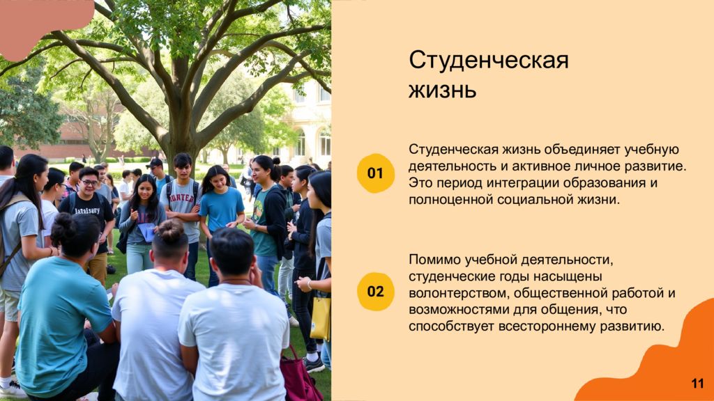Студенческая жизнь объединяет учебную деятельность и активное личное развитие. Это период интеграции образования и полноценной социальной жизни. Помимо учебной деятельности, студенческие годы насыщены волонтерством, общественной работой и возможностями для общения, что способствует всестороннему развитию. Студенческая жизнь 11