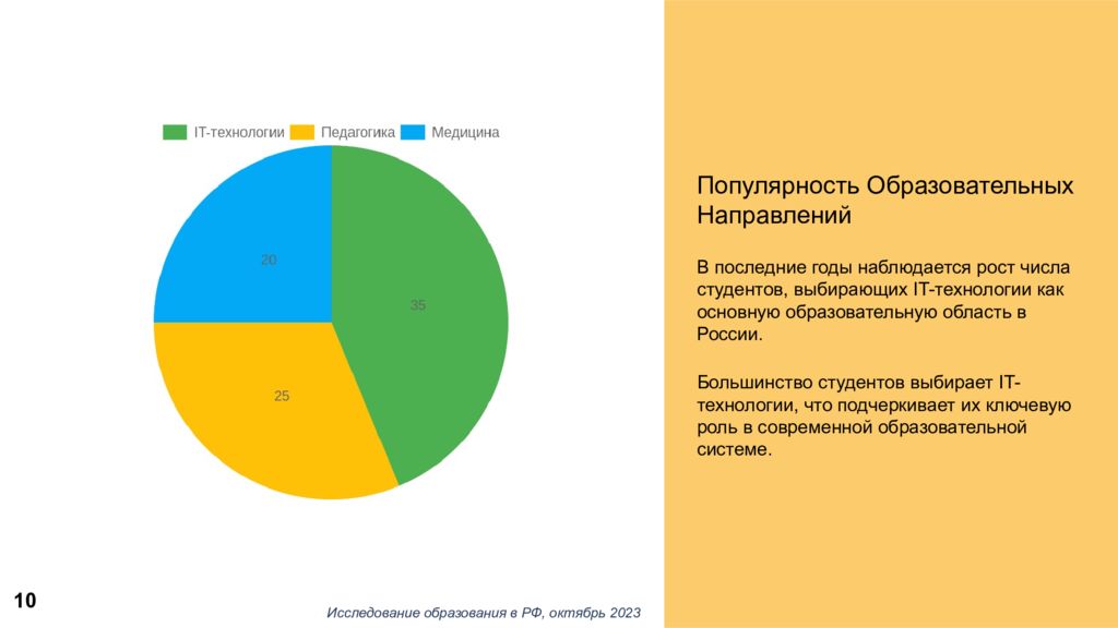 Популярность Образовательных Направлений В последние годы наблюдается рост числа студентов, выбирающих IT-технологии как основную образовательную область в России. Большинство студентов выбирает IT-технологии, что подчеркивает их ключевую роль в современной образовательной системе. Исследование образования в РФ, октябрь 2023 10