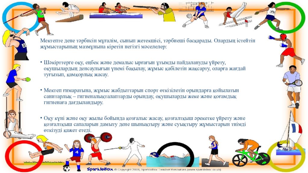 Мектепте дене тәрбисін мұғалім, сынып жетекшісі, тәрбиеші басқарады. Олардың істейтін жұмыстарының мазмұнына кіретін негізгі мәселелер : Шәкірттерге оқу, еңбек және демалыс ырғағын ұтымды пайдалануды үйрету, оқушылардың денсаулығын үнемі бақылау, жұмыс қабілетін жақсарту, оларға жағдай туғызып, қамқорлық жасау. Мектеп ғимаратына, жұмыс жабдыттарын спорт өткізілетін орындарға қойылатын санитарлық – гигиеналықталаптарды орындау, оқушыларды жеке және қоғамдық гигиенаға дағдыландыру. Оқу күні және оқу жылы бойында қозғалыс жасау, қозғалтқыш әрекетке үйрету және қозғалтқыш сапаларын дамыту дене шынықтыру және суықтыру жұмыстарын тиімді өткізуді қажет етеді.