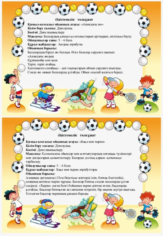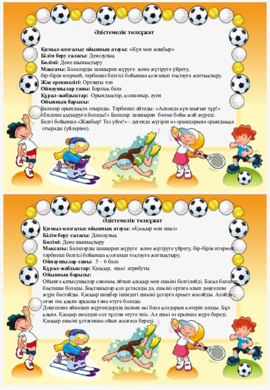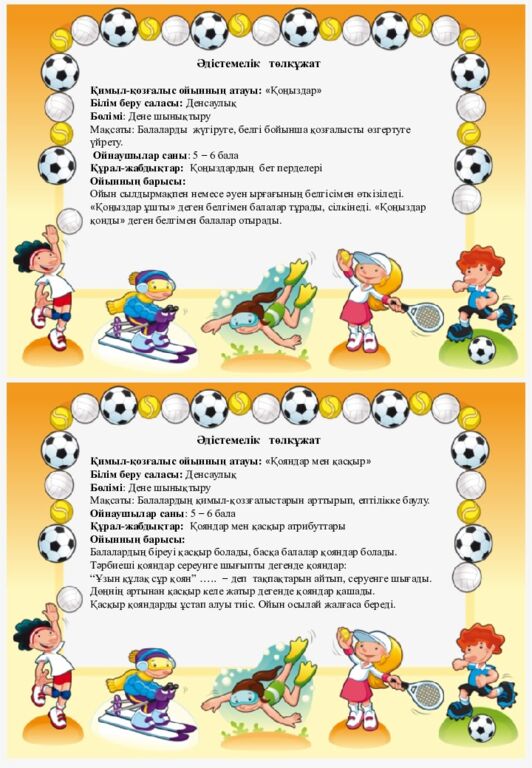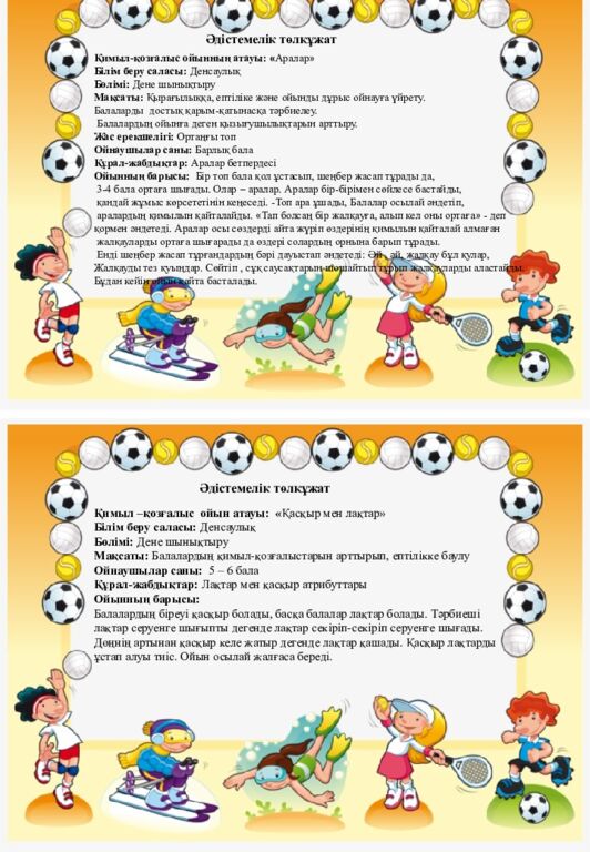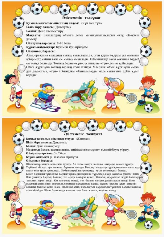 Қимыл-қозғалыс ойынның атауы: «Күн мен түн» Білім беру саласы: Денсаулық Бөлімі : Дене шынықтыру Мақсаты: Балалардың ойынға деген қызығушылықтарын ояту, ой-өрісін дамыту. Ойнаушылар саны : 8-10 бала Құрал-жабдықтар: Күн мен түн атрибуты Ойынның барысы: Алаң ортасына көлденең сызық сызылады да, оған қарама-қарсы екі жағынан әрбір метр сайын тағы екі сызық сызылады. Ойыншылар саны жағынан бірдей екі топқа бөлінеді. Топтың біріне «күн», екіншісіне «түн» деп ат қойылады. Ойын жүргізуші топтың бірінің атын атайды. Мәселен: ойын жүргізуші «күн» деп дауыстаса, «түн» тобындағы ойыншыларды мәре сызығына дейін қуып барады. Әдістемелік төлқұжат Қимыл-қозғалыс ойынның атауы: «Жапалақ» Білім беру саласы: Денсаулық Бөлімі : Дене шынықтыру Мақсаты: Баланы шапшаңдыққа, ептілікке және мұқият тыңдай білуге үйрету. Ойнаушылар саны : 5 - 7 бала Құрал-жабдықтар: Жапалақ атрибуты Ойынның барысы: Ойыншылар алаңға емін еркін тұрады. Ал келесі жақта жапалақ отырады немесе тұрады. Тәрбиеші айтады: күн шығып, барлығы оянады. Балалар алаңда әр түрлі қимыл-қозғалыстарды жасап емін-еркін қозғалады. Көбелектерді, шегірткелерді қуып ұстамақшы болады. Кенет тәрбиеші түн болды, барлықтарың орындарыңда тұрыңдар, қазір жапалақ ұшады дейді. Осы уақытта барлық балалар тез арада тоқтауы қажет. Жапалақ ақырындап жүріп балалардың қасынан қарап өтеді. Кім қозғалып, күледі, сол баланы жапалақ ұясына алып кетеді. Біраз уақыттан кейін ойын аяқталып, тәрбиеші жапалақтың қанша баланы ұясына алып кеткенін санайды. Осыдан кейін жаңа ойын басталып, жапалақтың қарамағына түспеген баланы жапалақ етіп сайлайды. Ойын барысында жапалақ көп бала жинаса, жеңіске жетеді. Әдістемелік төлқұжат
