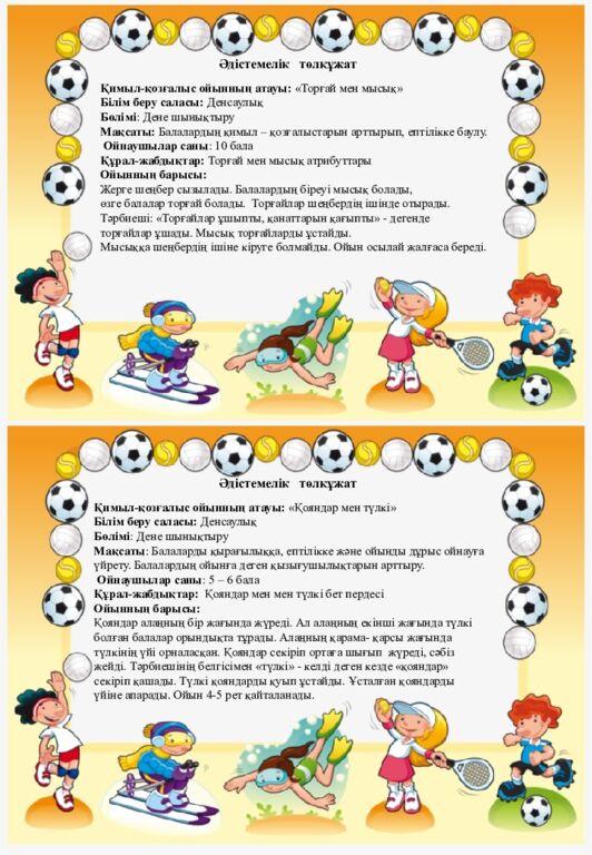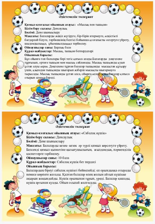 Қимыл-қозғалыс ойынның атауы: «Ұшақтар» Білім беру саласы: Денсаулық Бөлімі : Дене шынықтыру Мақсаты: Балаларды дұрыс жүгіруге, белгі бойынша қозғалуға үйрету Ойнаушылар саны : 5 – 6 бала Құрал-жабдықтар: Ұшақтардың атрибуттары Ойынның барысы: Балалар бөлменің бір жағында орындықтарда отырады. Тәрбиеші қолдарын кеудесіне қойып айналдыра «р- р- р» деп ұшақтың моторының қалай жұмыс жасайтынын көрсетеді. Содан соң балаларға: «Тұрыңдар, моторды қосып ұшуға дайындалайық» - дейді. Барлығы тәрбиешінің қимылын қайталайды. Тәрбиешінің «қондық» деген белгісі бойынша орындарына отырады. Ойын қайталанады. Әдістемелік төлқұжат Қимыл-қозғалыс ойынның атауы: «Әтеш айқасы» Білім беру саласы: Денсаулық Бөлімі : Дене шынықтыру Мақсаты: Белсенді қимыл қызметіне қызығушылығын, жалпы төзімділігін, жылдамдық, пәрменділік қасиеттеріне тәрбиелеу. Құрал-жабдықтар : Әтеш бетпердесі Ойынның барысы: Екі топтан екі бала ортаға тұрады, екеуі де сол аяқтарын бұрып, сол қолымен ұстап көтеріп тұрады. Оң қолдарын кеуделеріне қояды.Содан соң кәдімгі әтешке ұқсап, бір-біріне ұмтылып иық қағыстырады. Қайсысы жығылса, не бүгілген аяғын түсіріп алса ұтылады. Осылайша топ мүшелері түгел ойнап болғаннан кейін, көп ұпай жинаған топ жеңеді. Әдістемелік төлқұжат