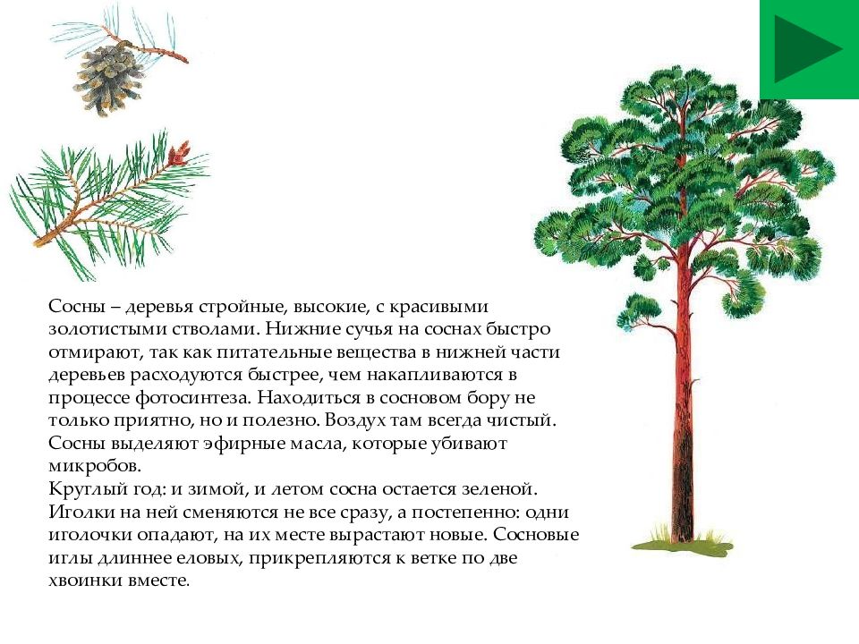 Сосны – деревья стройные, высокие, с красивыми золотистыми стволами. Нижние сучья на соснах быстро отмирают, так как питательные вещества в нижней части деревьев расходуются быстрее, чем накапливаются в процессе фотосинтеза. Находиться в сосновом бору не только приятно, но и полезно. Воздух там всегда чистый. Сосны выделяют эфирные масла, которые убивают микробов. Круглый год: и зимой, и летом сосна остается зеленой. Иголки на ней сменяются не все сразу, а постепенно: одни иголочки опадают, на их месте вырастают новые. Сосновые иглы длиннее еловых, прикрепляются к ветке по две хвоинки вместе.