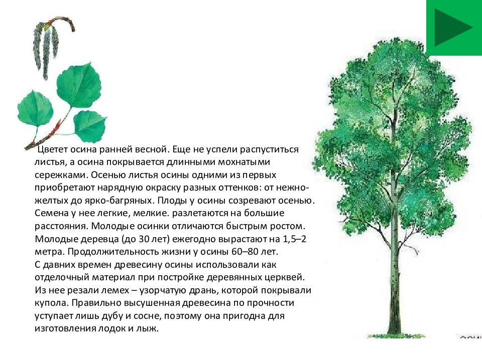 Цветет осина ранней весной. Еще не успели распуститься листья, а осина покрывается длинными мохнатыми сережками. Осенью листья осины одними из первых приобретают нарядную окраску разных оттенков: от нежно-желтых до ярко-багряных. Плоды у осины созревают осенью. Семена у нее легкие, мелкие. разлетаются на большие расстояния. Молодые осинки отличаются быстрым ростом. Молодые деревца (до 30 лет) ежегодно вырастают на 1,5–2 метра. Продолжительность жизни у осины 60–80 лет. С давних времен древесину осины использовали как отделочный материал при постройке деревянных церквей. Из нее резали лемех – узорчатую дрань, которой покрывали купола. Правильно высушенная древесина по прочности уступает лишь дубу и сосне, поэтому она пригодна для изготовления лодок и лыж.