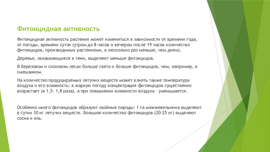 Фитонцидная активность растения может изменяться в зависимости от времени года, от погоды, времени суток (утром до 8 часов и вечером после 19 часов количество фитонцидов, производимых растениями, в несколько раз меньше, чем днем). Деревья, оказывающиеся в тени, выделяют меньше фитонцидов. В березовом и сосновом лесах больше света и больше фитонцидов, чем, например, в смешанном. На количество продуцируемых летучих веществ может влиять также температура воздуха и его влажность: в жаркую погоду концентрация фитонцидов существенно возрастает (в 1,5– 1,8 раза), а при повышении влажности воздуха – уменьшается. Особенно много фитонцидов образуют хвойные породы: 1 га можжевельника выделяют в сутки 30 кг летучих веществ. Большое количество фитонцидов (20-25 кг) выделяют сосна и ель.