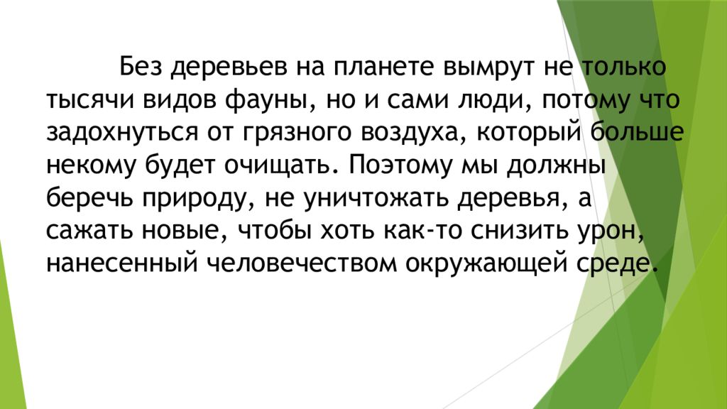 Без деревьев на планете вымрут не только тысячи видов фауны, но и сами люди, потому что задохнуться от грязного воздуха, который больше некому будет очищать. Поэтому мы должны беречь природу, не уничтожать деревья, а сажать новые, чтобы хоть как-то снизить урон, нанесенный человечеством окружающей среде.