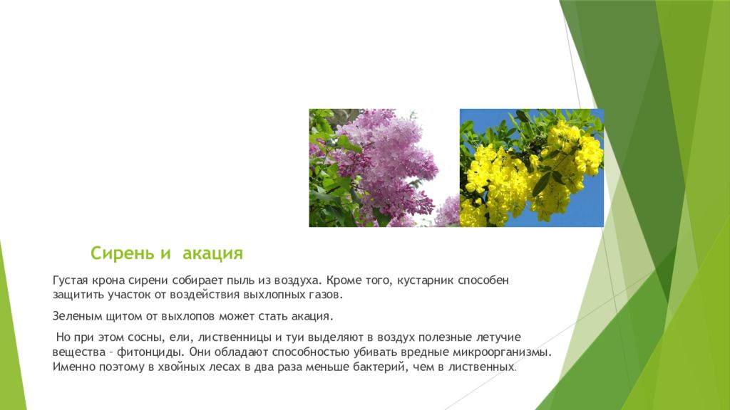 Густая крона сирени собирает пыль из воздуха. Кроме того, кустарник способен защитить участок от воздействия выхлопных газов. Зеленым щитом от выхлопов может стать акация. Но при этом сосны, ели, лиственницы и туи выделяют в воздух полезные летучие вещества – фитонциды. Они обладают способностью убивать вредные микроорганизмы. Именно поэтому в хвойных лесах в два раза меньше бактерий, чем в лиственных.