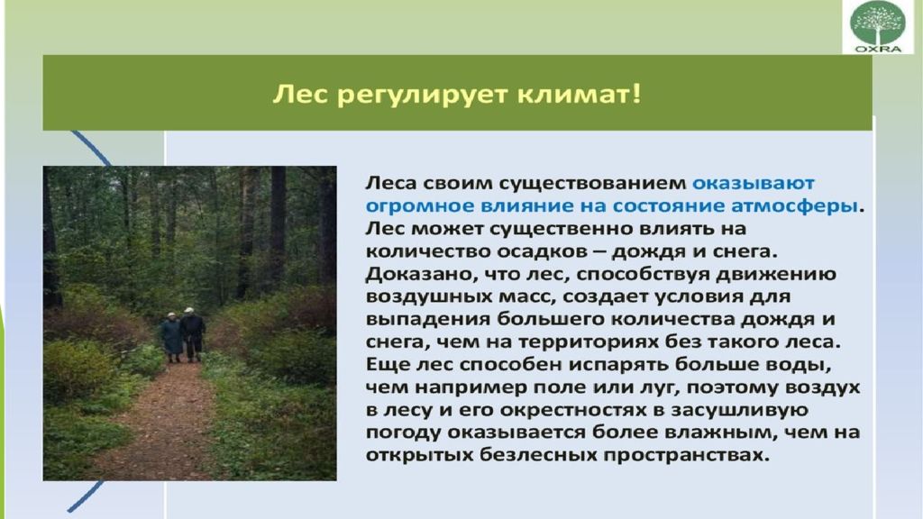 Ч ем больше деревьев, тем прохладнее становится атмосфера, и тем меньше вредных веществ испаряется и выделяется в воздух. Также древесные растения выделяют полезные вещества – фитонциды, способные уничтожать вредные грибы и микробы