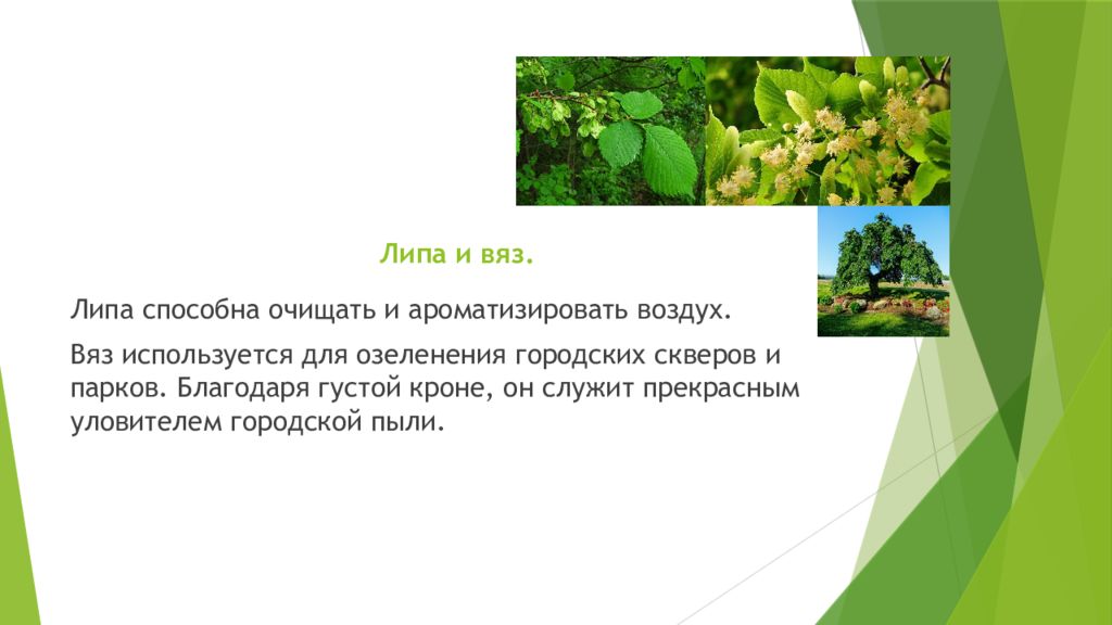 Липа способна очищать и ароматизировать воздух. Вяз используется для озеленения городских скверов и парков. Благодаря густой кроне, он служит прекрасным уловителем городской пыли.
