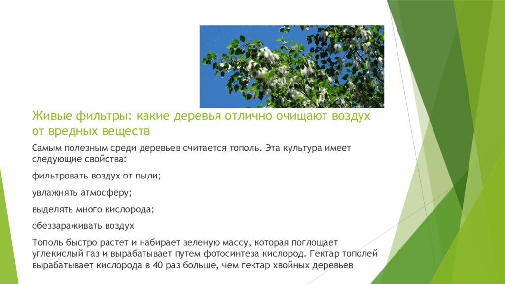 Самым полезным среди деревьев считается тополь. Эта культура имеет следующие свойства: фильтровать воздух от пыли; увлажнять атмосферу; выделять много кислорода; обеззараживать воздух Тополь быстро растет и набирает зеленую массу, которая поглощает углекислый газ и вырабатывает путем фотосинтеза кислород. Гектар тополей вырабатывает кислорода в 40 раз больше, чем гектар хвойных деревьев