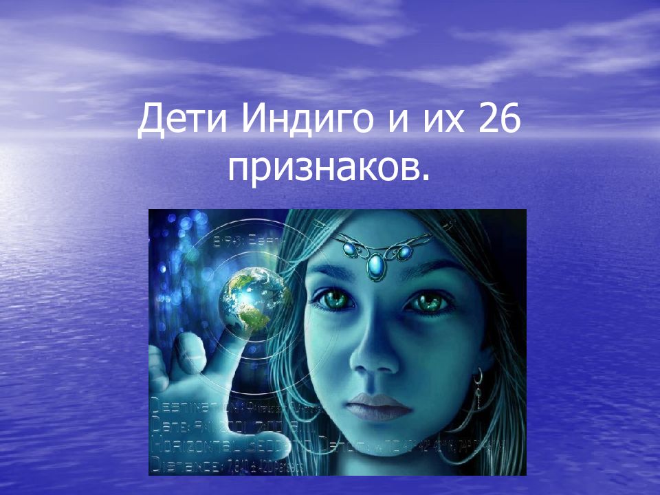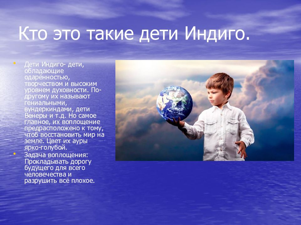 Дети Индиго- дети, обладающие одарённостью, творчеством и высоким уровнем духовности. По-другому их называют гениальными, вундеркиндами, дети Венеры и т.д. Но самое главное, их воплощение предрасположено к тому, чтоб восстановить мир на земле. Цвет их ауры ярко-голубой. Задача воплощения: Прокладывать дорогу будущего для всего человечества и разрушить всё плохое.