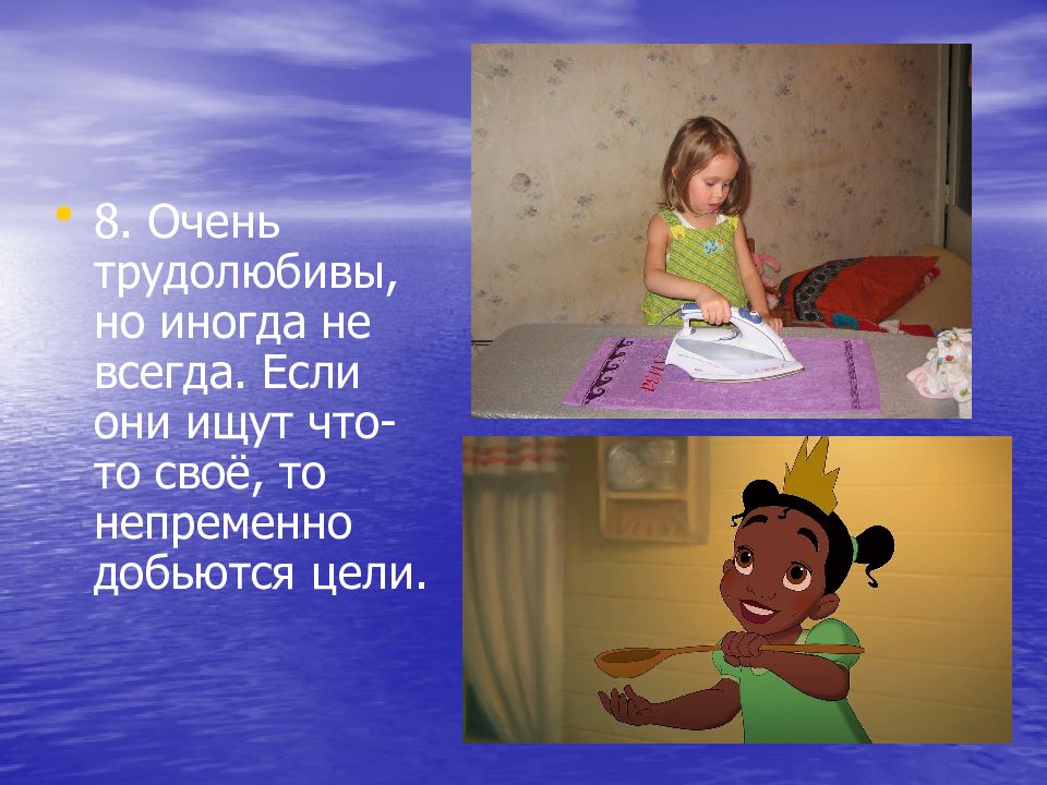 8. Очень трудолюбивы, но иногда не всегда. Если они ищут что-то своё, то непременно добьются цели.
