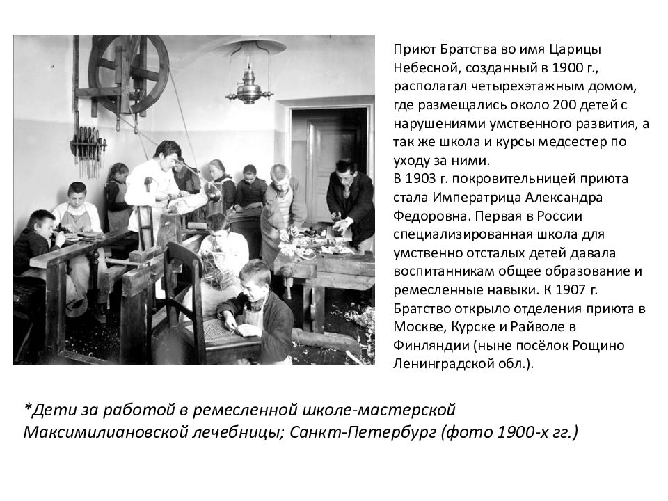 Первый слайд презентации: Дети за работой в ремесленной школе-мастерской Максимилиановской лечебницы; Санкт-Петербург (фото 1900-х гг.)