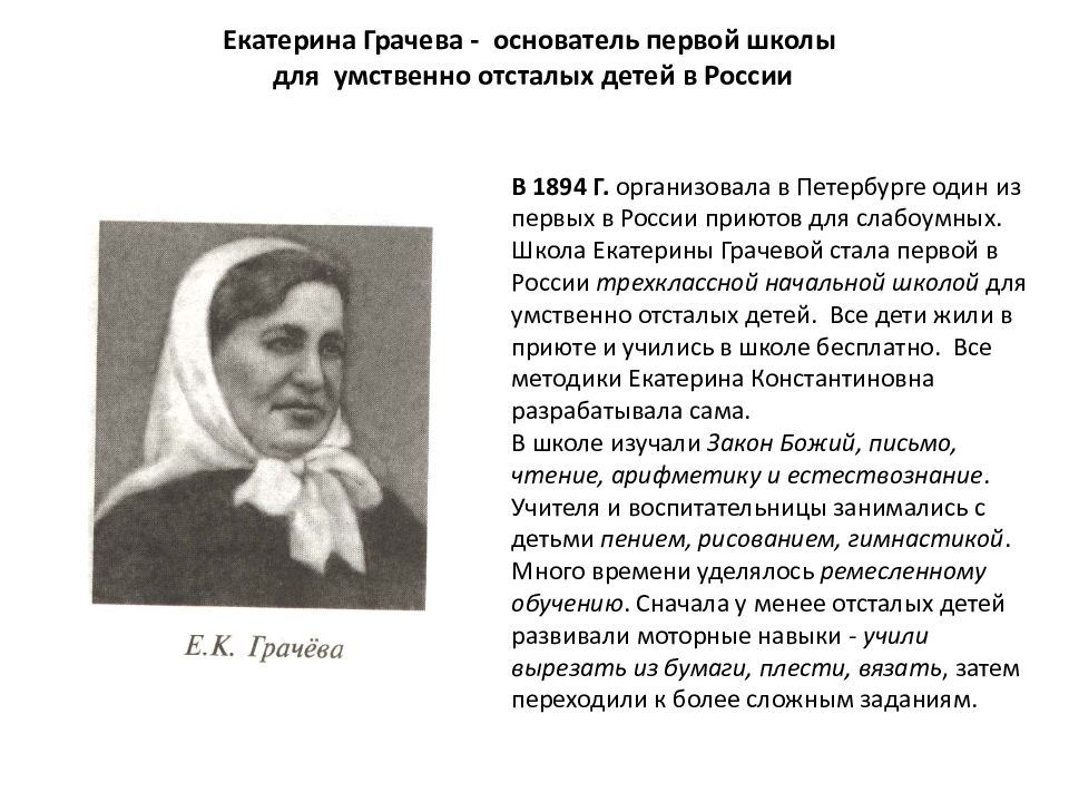 В 1894 Г. организовала в Петербурге один из первых в России приютов для слабоумных. Школа Екатерины Грачевой стала первой в России трехклассной начальной школой для умственно отсталых детей. Все дети жили в приюте и учились в школе бесплатно. Все методики Екатерина Константиновна разрабатывала сама. В школе изучали Закон Божий, письмо, чтение, арифметику и естествознание. Учителя и воспитательницы занимались с детьми пением, рисованием, гимнастикой. Много времени уделялось ремесленному обучению. Сначала у менее отсталых детей развивали моторные навыки - учили вырезать из бумаги, плести, вязать, затем переходили к более сложным заданиям.