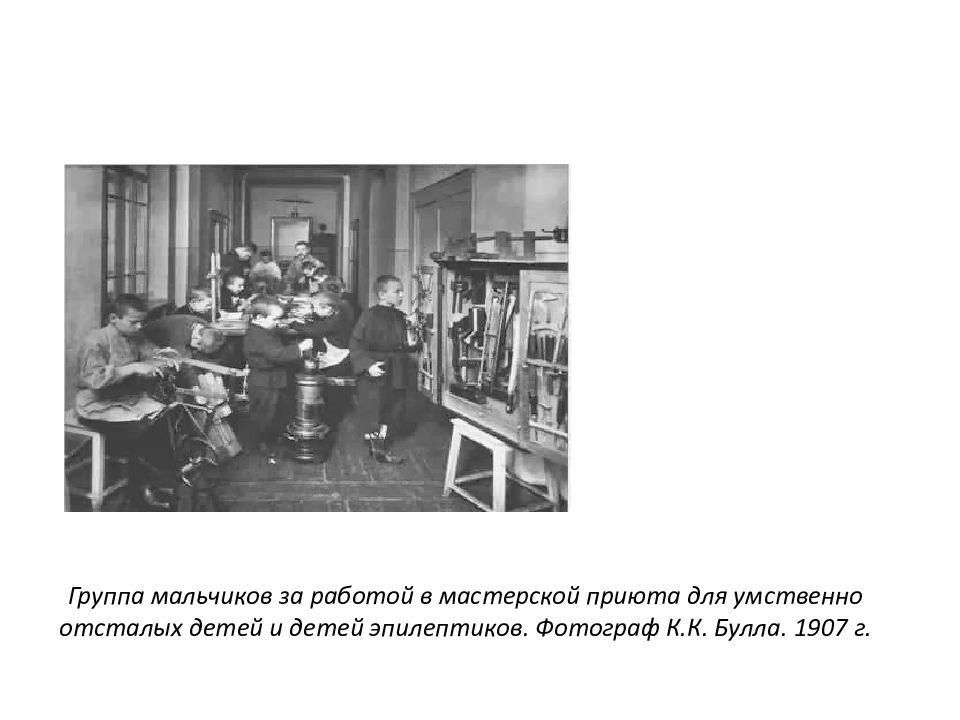 Слайд 3: Группа мальчиков за работой в мастерской приюта для умственно отсталых детей и детей эпилептиков. Фотограф К.К. Булла. 1907 г