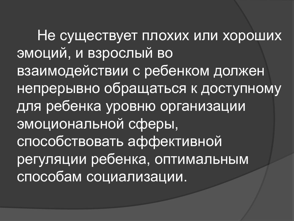 Не существует плохих или хороших эмоций, и взрослый во взаимодействии с ребенком должен непрерывно обращаться к доступному для ребенка уровню организации эмоциональной сферы, способствовать аффективной регуляции ребенка, оптимальным способам социализации.