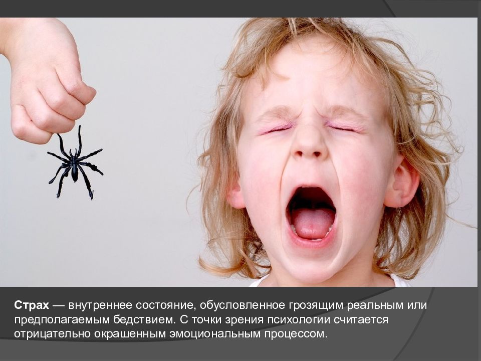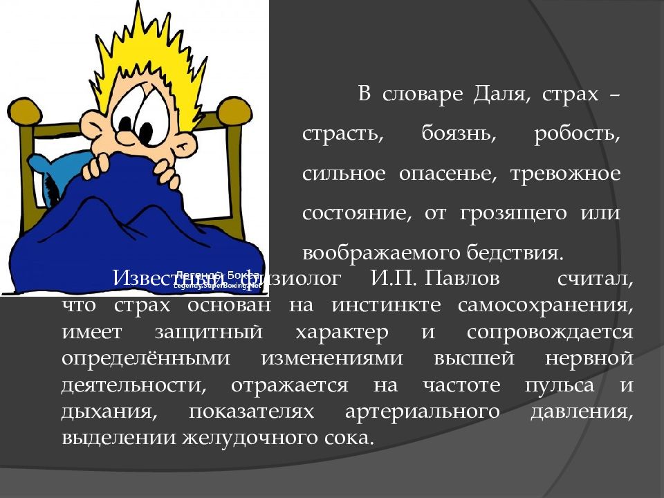 В словаре Даля, страх – страсть, боязнь, робость, сильное опасенье, тревожное состояние, от грозящего или воображаемого бедствия. Известный физиолог И.П. Павлов считал, что страх основан на инстинкте самосохранения, имеет защитный характер и сопровождается определёнными изменениями высшей нервной деятельности, отражается на частоте пульса и дыхания, показателях артериального давления, выделении желудочного сока.
