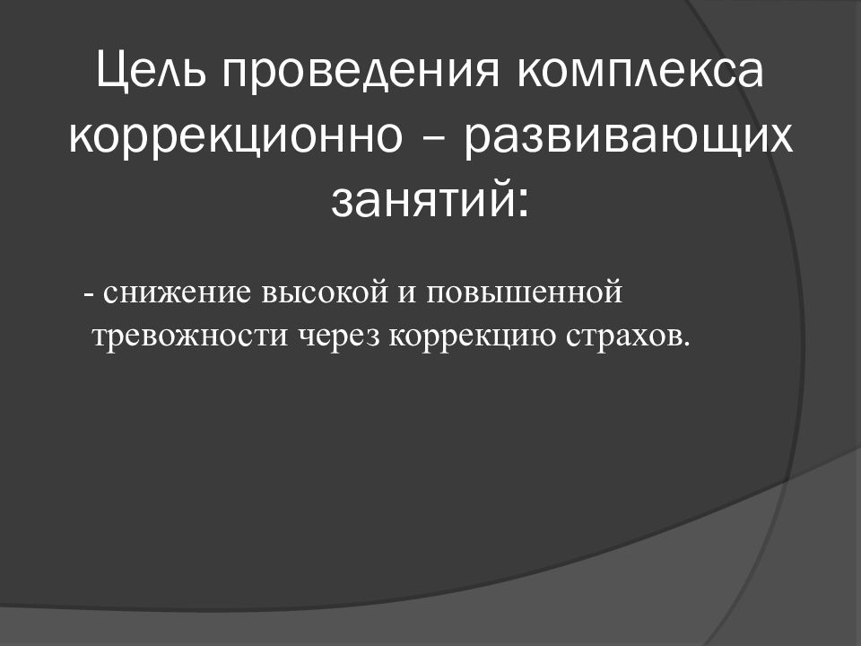 - снижение высокой и повышенной тревожности через коррекцию страхов. Цель проведения комплекса коррекционно – развивающих занятий: