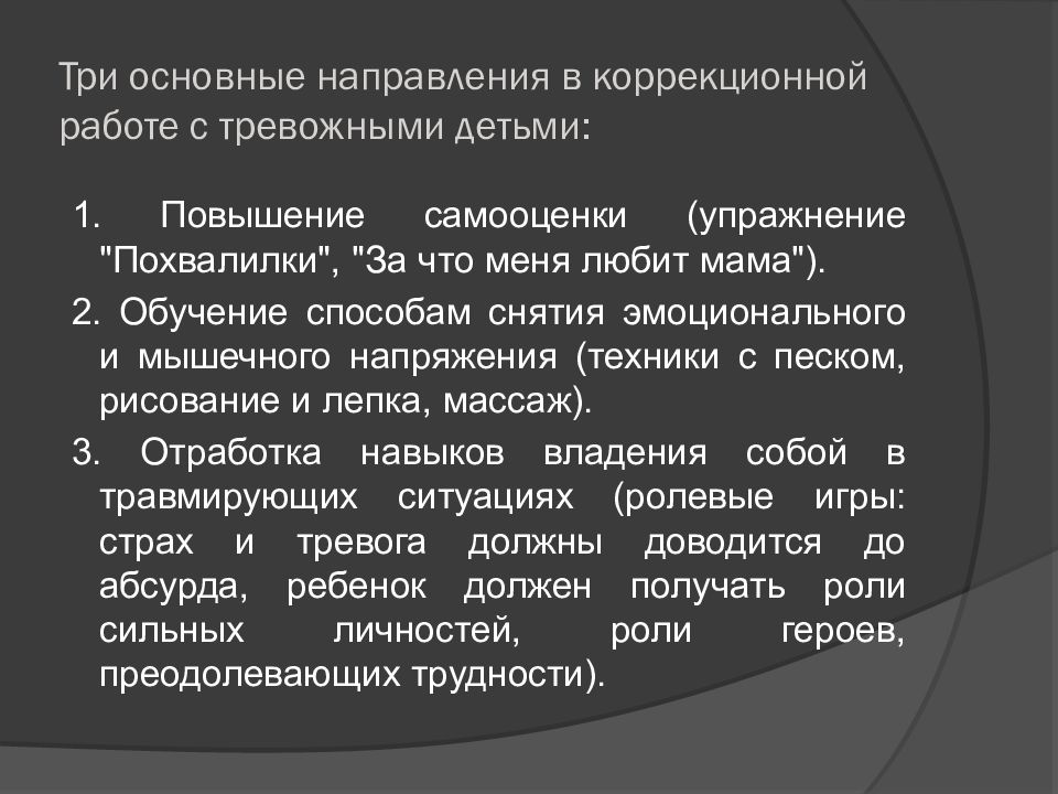 Слайд 12: Три основные направления в коррекционной работе с тревожными детьми: